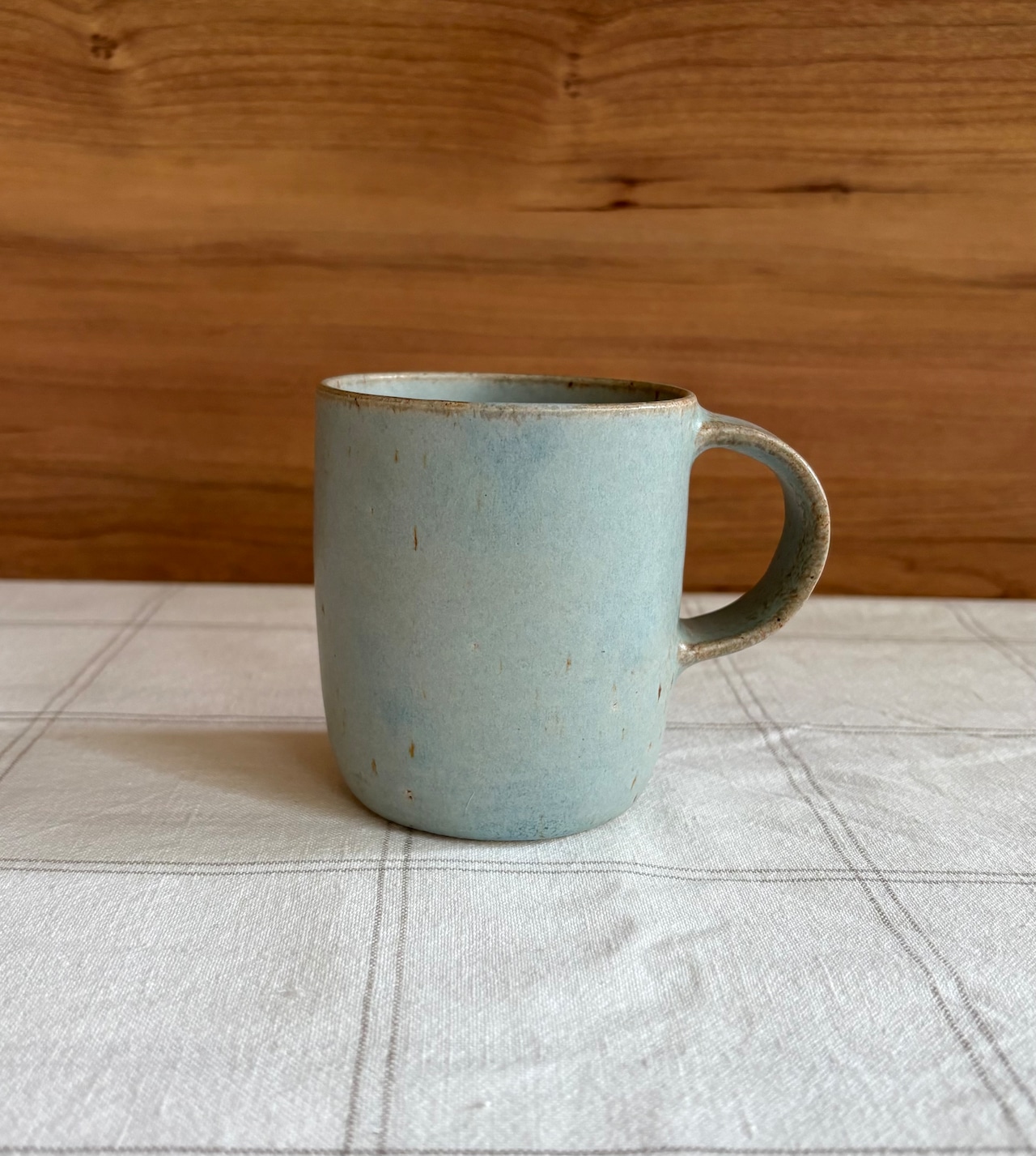 温かみのあるマットな風合い、やさしい霞がかった空のような色は、溶け込むように暮らしに寄り添ってくれるお品です。別掲載の緑のマグとのペア使いもおすすめです。