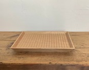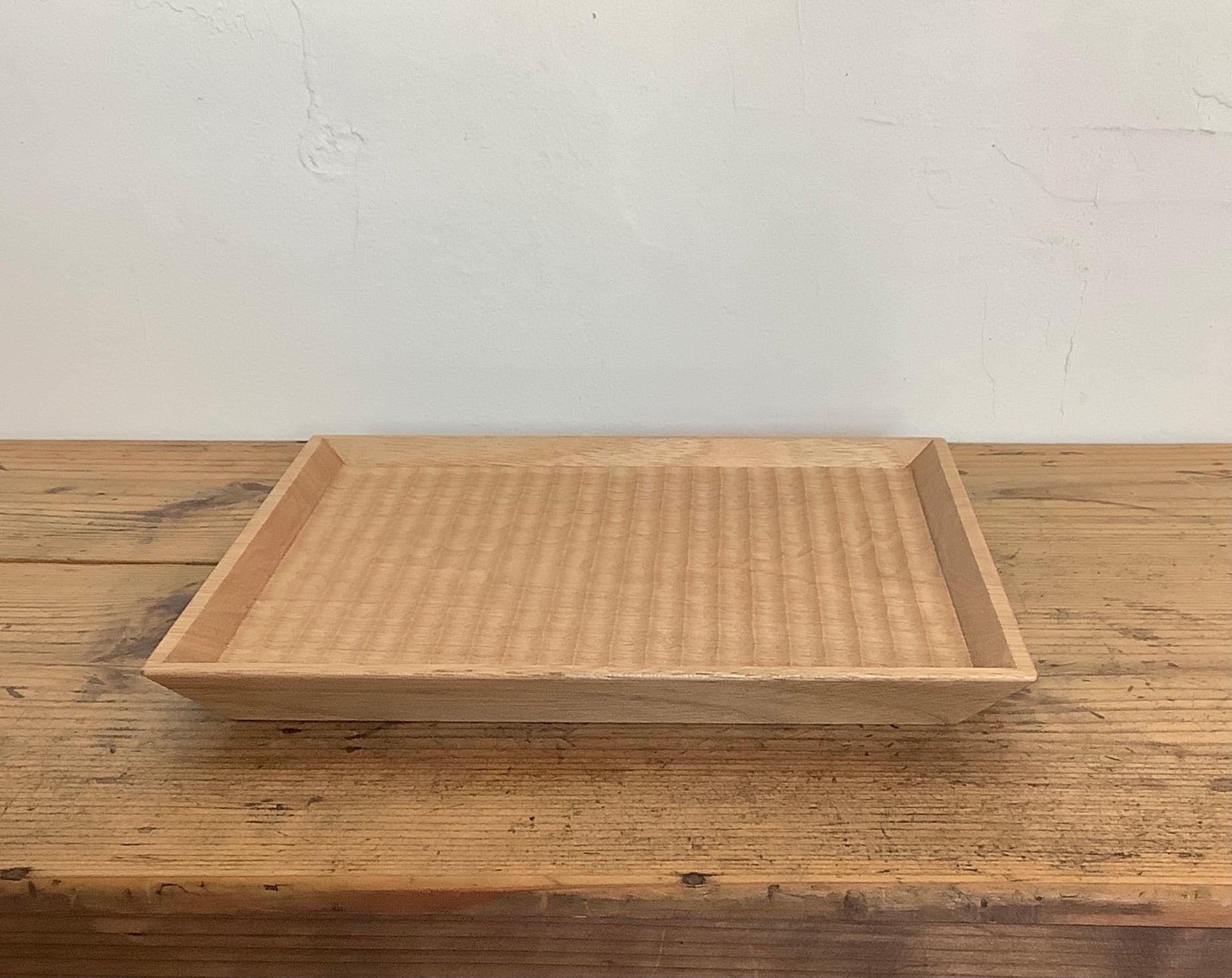 彫刀の真っ直ぐなラインが気持ち良い角皿です。木目の描く曲線と彫刀の調和が品良く飽きのこないお品です。オイル仕上げで使うほどに味わい深くなるのも木製品の魅力です。裏面もすべすべに滑らかに仕上げられており、手仕事の丁寧さが感じられます。