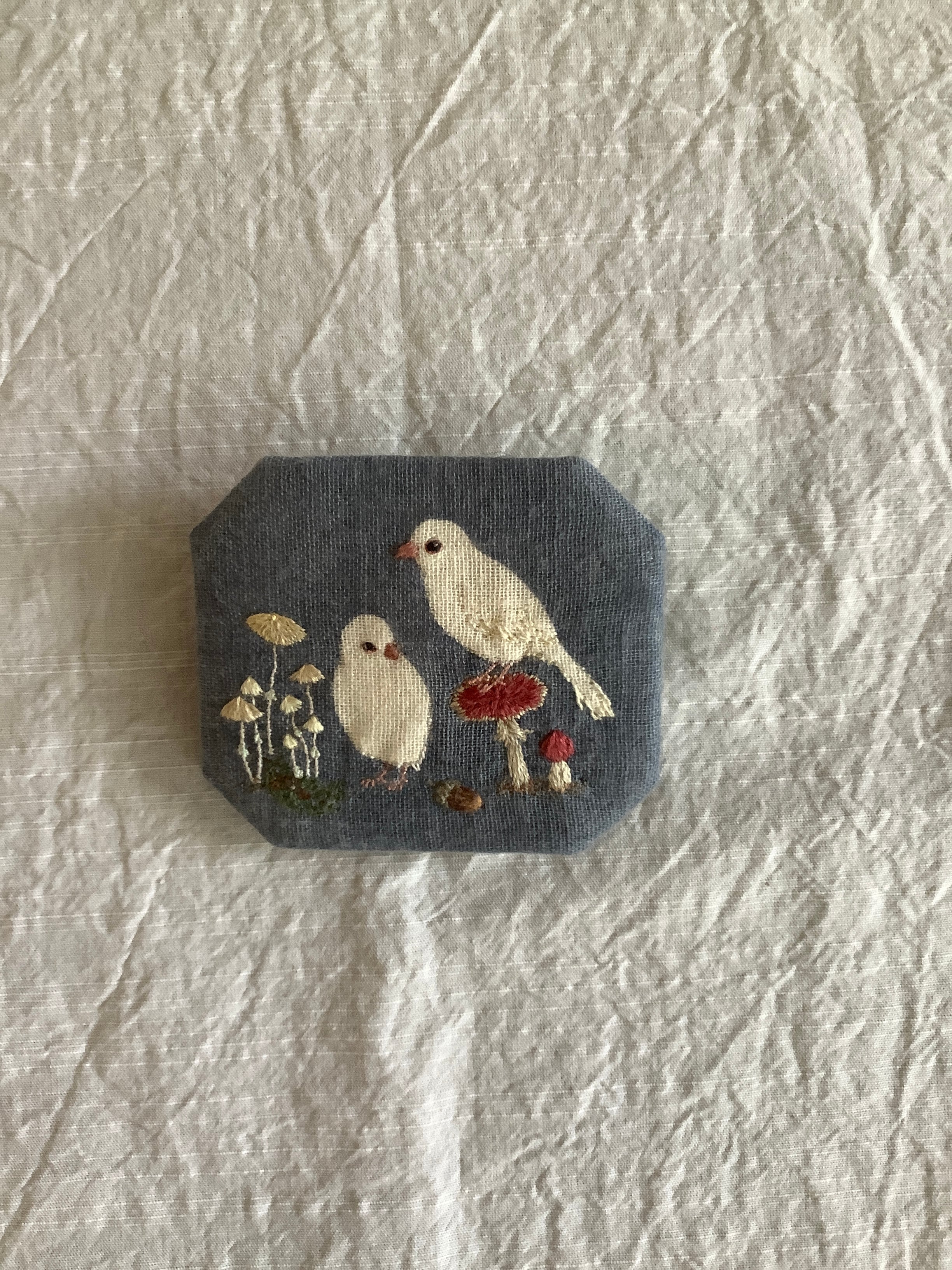 染め抜きと着彩でえがかれた文鳥と特徴あるキノコが刺繍されています。シックな色合わせで、静かな森の雰囲気が楽しめるお品です。
